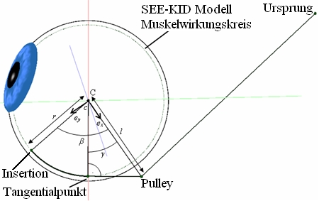 Das SEE-KID Active Pulley Modell unterscheidet sich vom SEE-KID Modell und vom Orbitmodell dadurch, dass bei diesem Modell die Pulleys nicht als fixe, statische Elemente simuliert werden, sondern sich aktiv mit dem Auge mitbewegen. So bewegt sich zum Beispiel der Pulley des m. rectus lateralis nach vorne, wenn das Auge in Adduktion blickt (siehe Abbildung) und nach hinten, wenn das Auge sich in Richtung Abduktion bewegt. Durch diese Bewegung wird die Hauptwirkungsrichtung des Muskels auch in extremen Blickpositionen optimal erhalten.